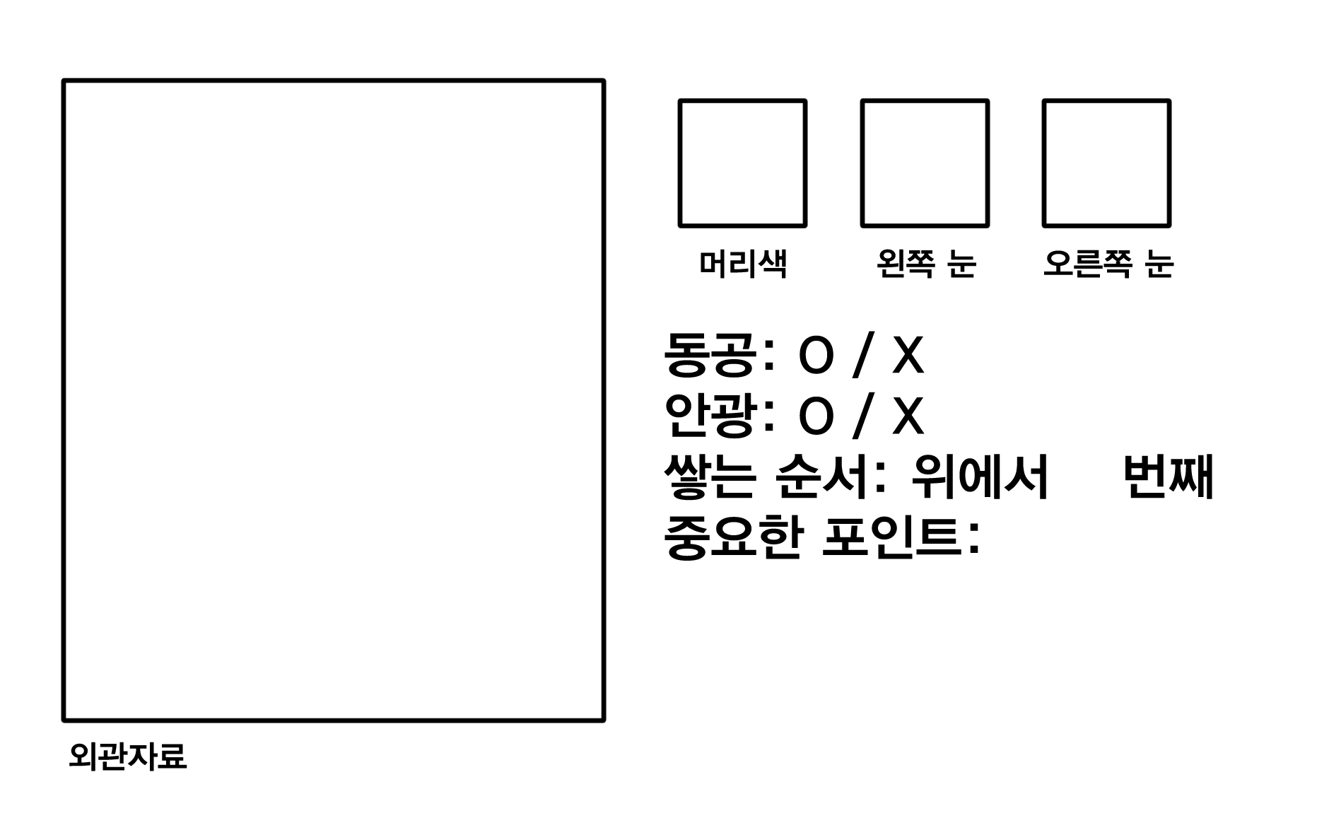 - 기본 틀에서 벗어나는 형태의 동공이나 안광 등은 특히 미리 설명 부탁드립니다. 글로만 쓰면 헷갈릴 것 같다면 간단하게라도 그림으로 그려서 첨부해 주시는 것을 추천드립니다.